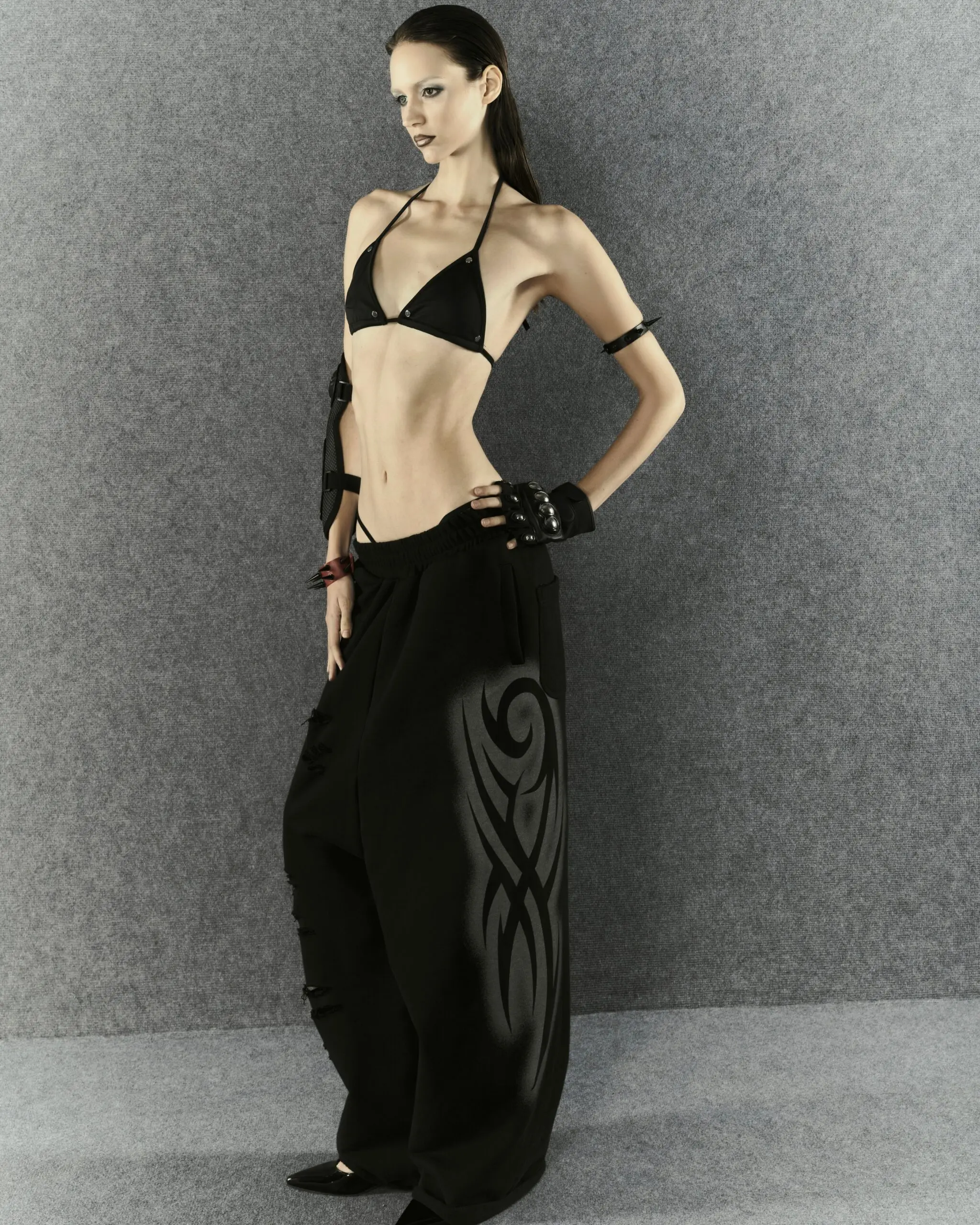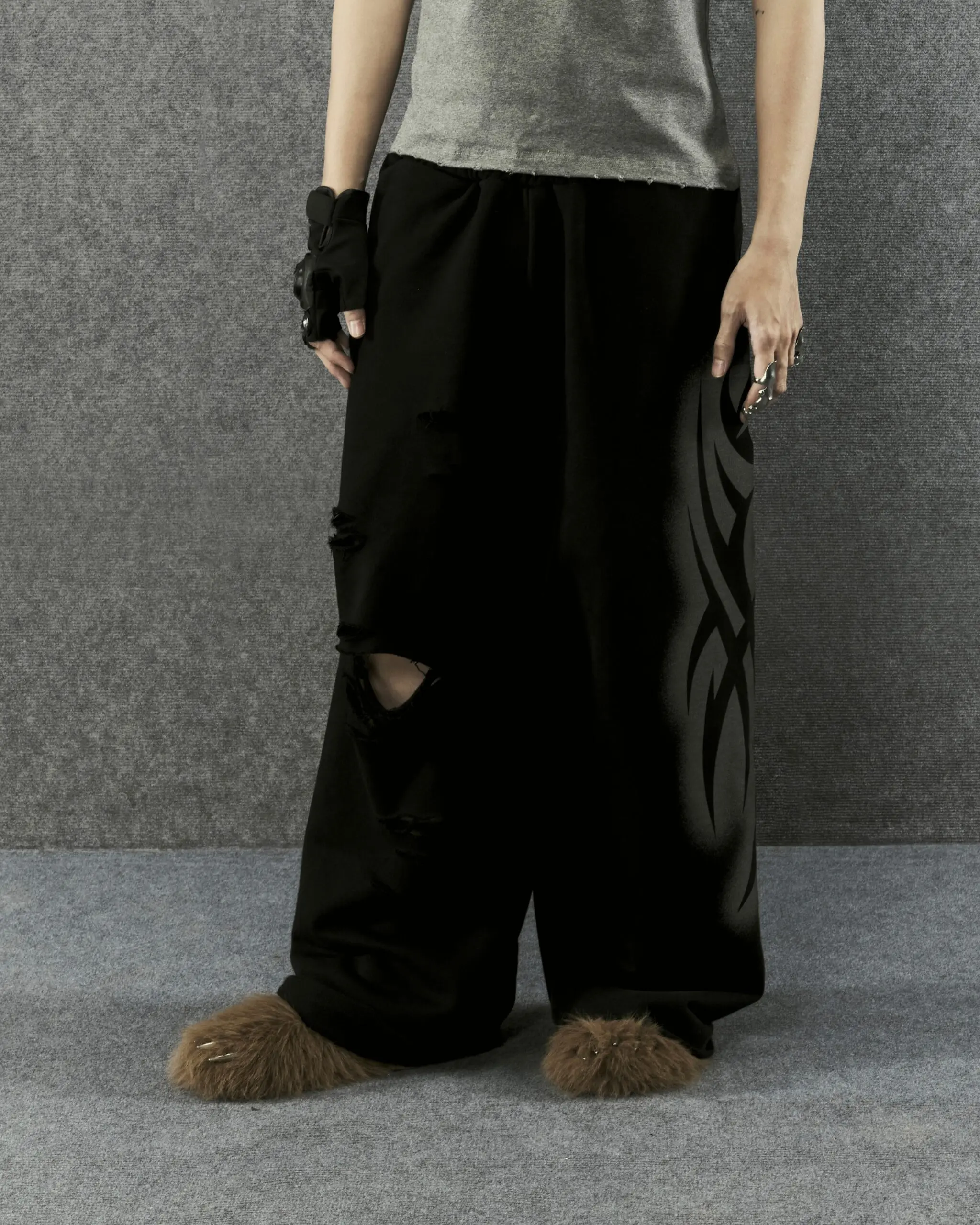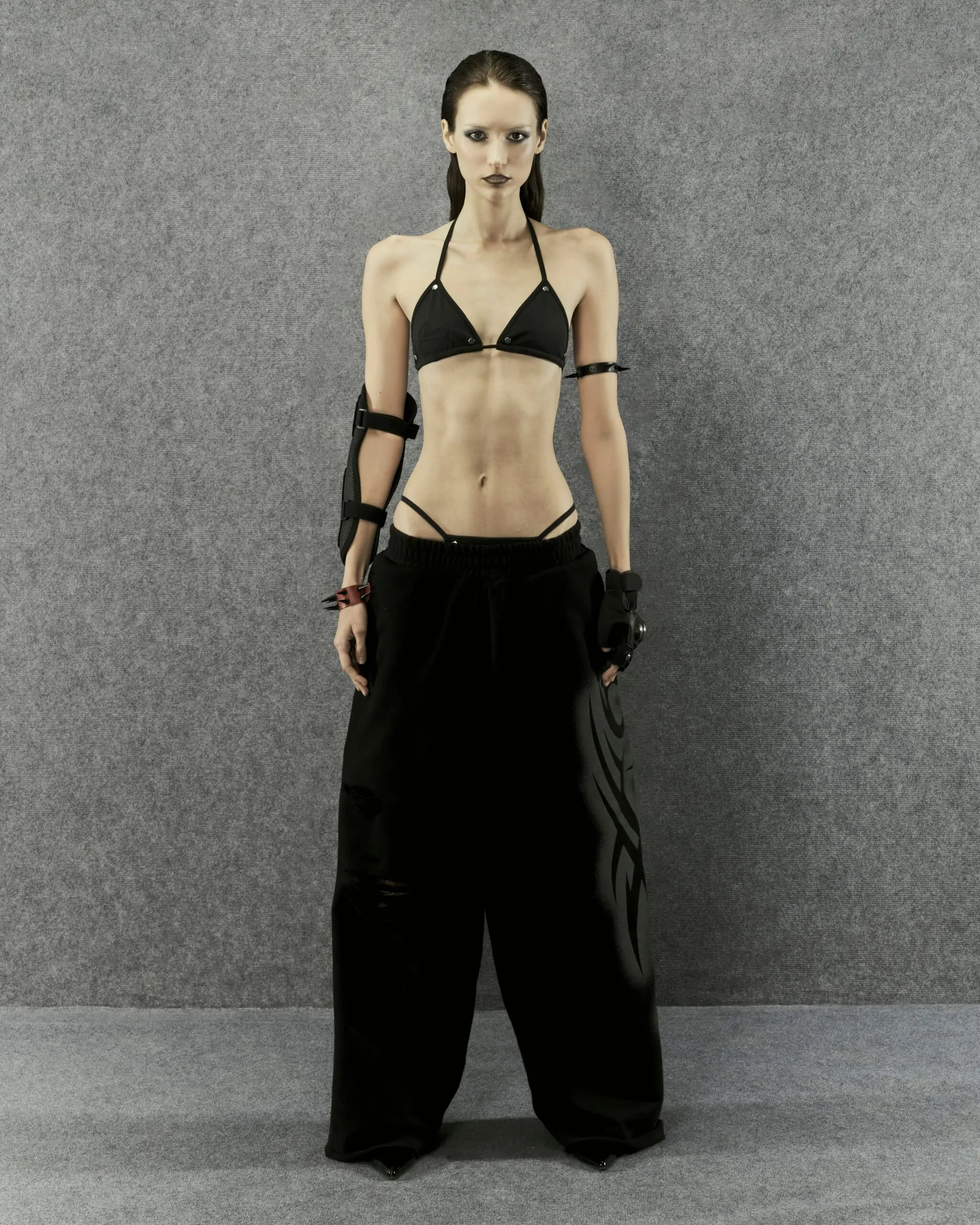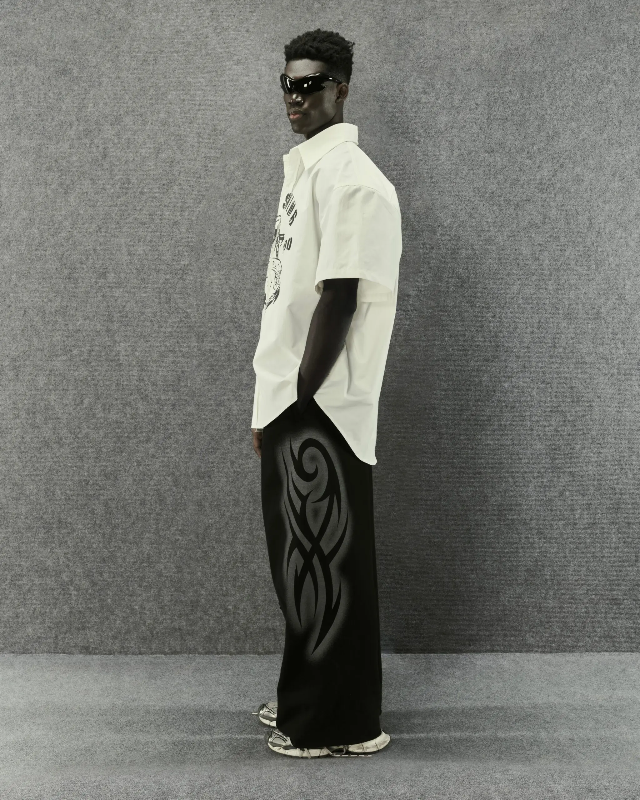 Designed in a bold oversized fit, the pants feature dual side pockets and two rear pockets for functional balance. A dropped crotch and wide-leg construction define the relaxed silhouette. One leg is finished with digitally printed cyber artwork, while the other is hand-distressed through artisanal techniques creating a raw contrast between graphic precision and organic imperfection.