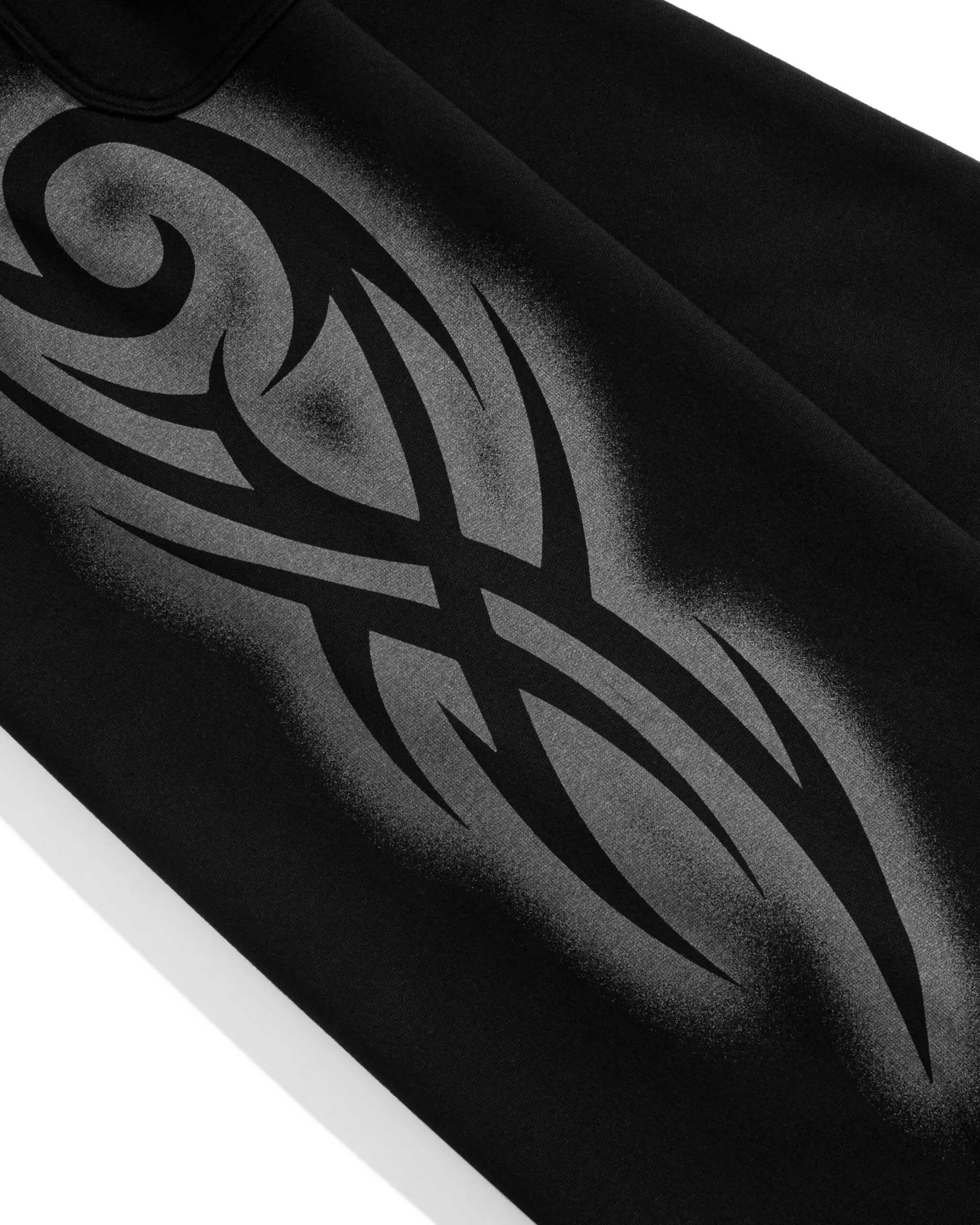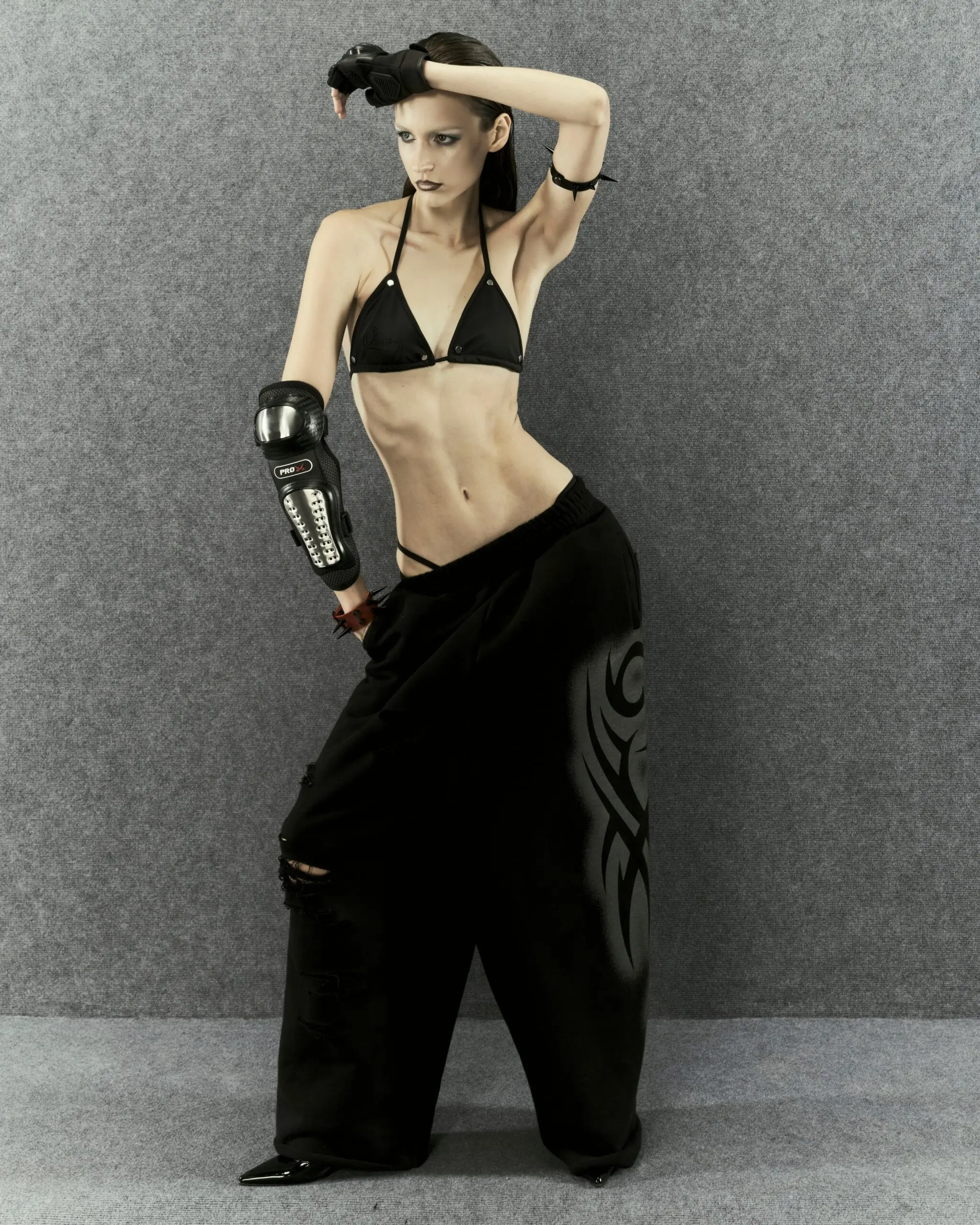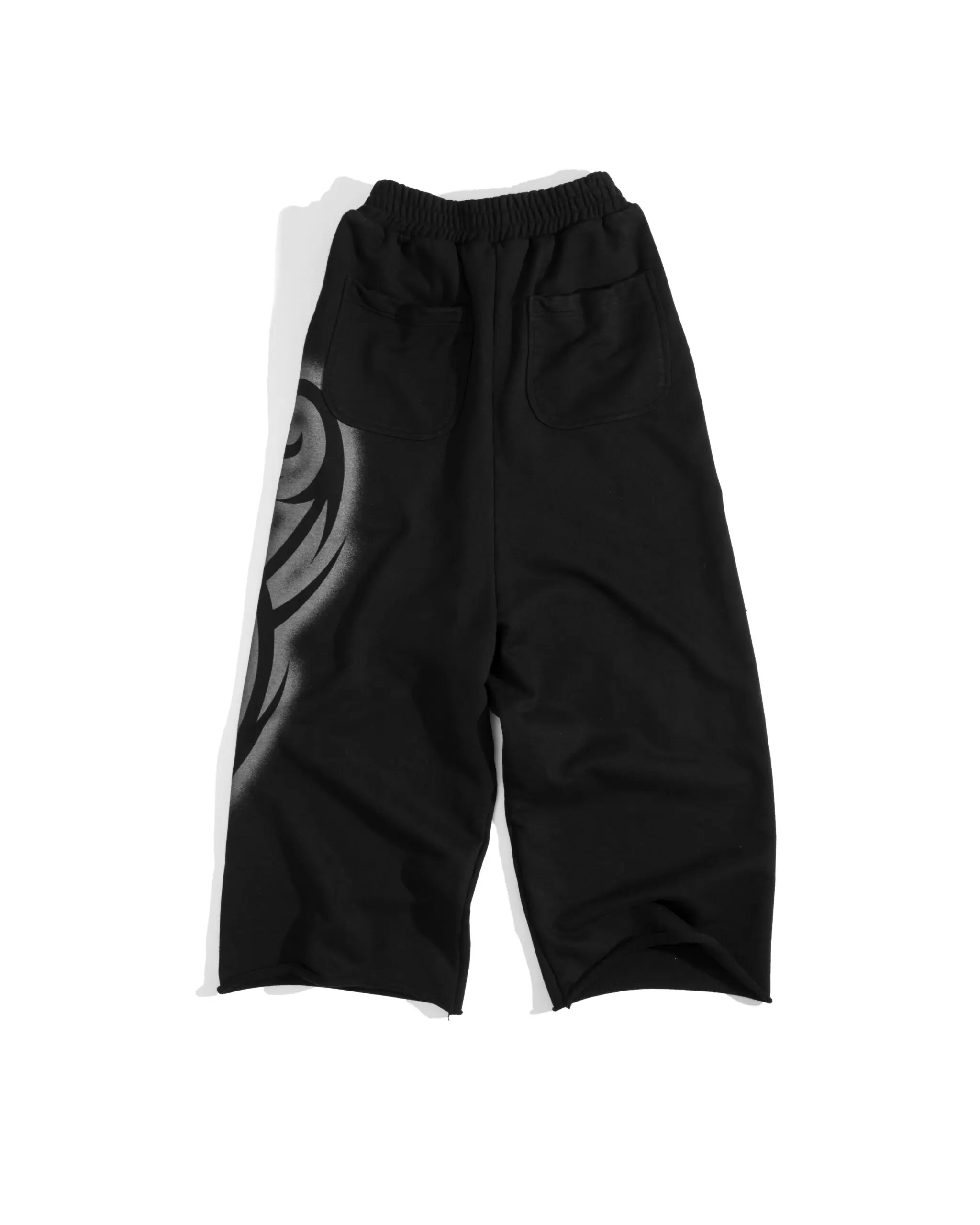 Designed in a bold oversized fit, the pants feature dual side pockets and two rear pockets for functional balance. A dropped crotch and wide-leg construction define the relaxed silhouette. One leg is finished with digitally printed cyber artwork, while the other is hand-distressed through artisanal techniques creating a raw contrast between graphic precision and organic imperfection.