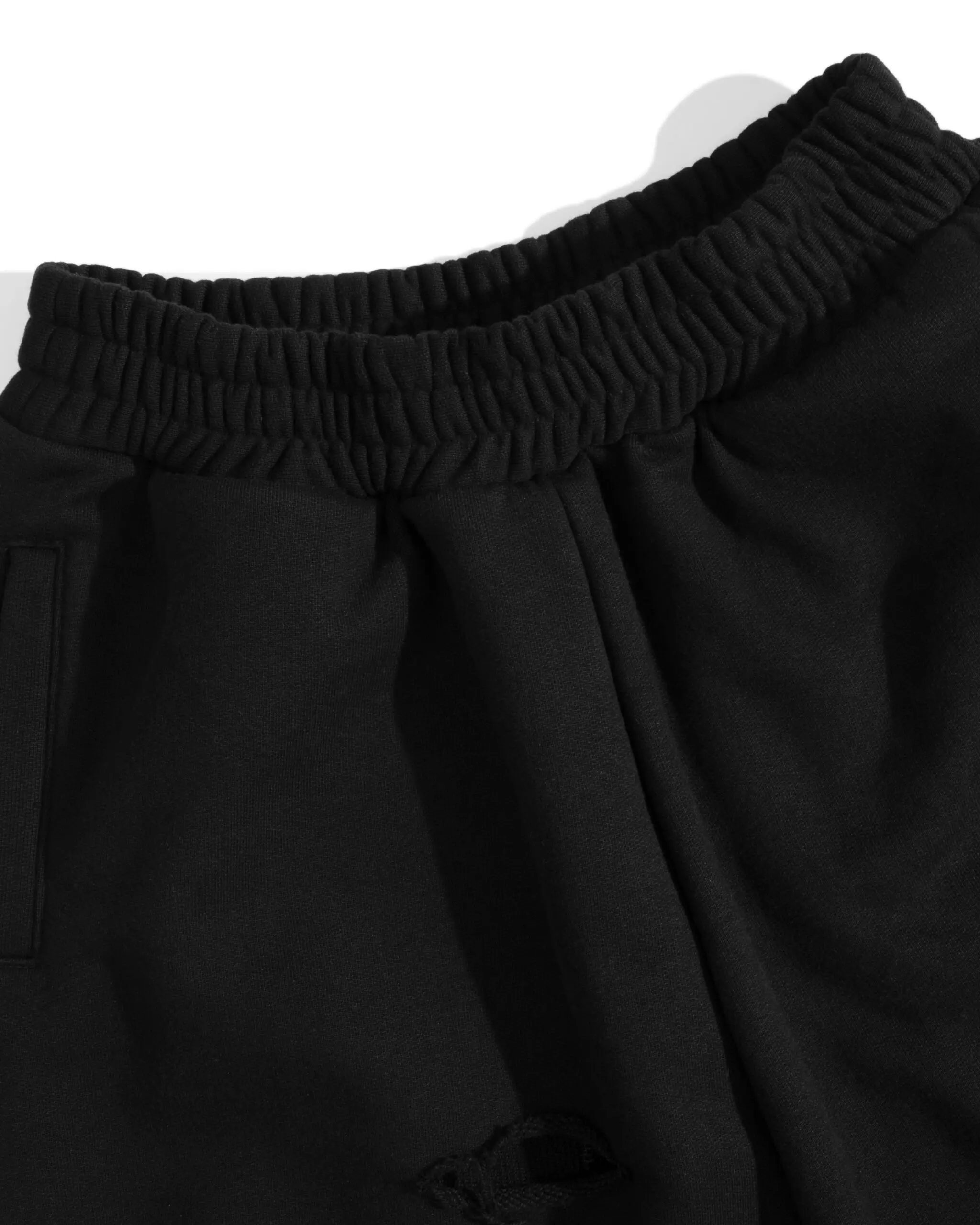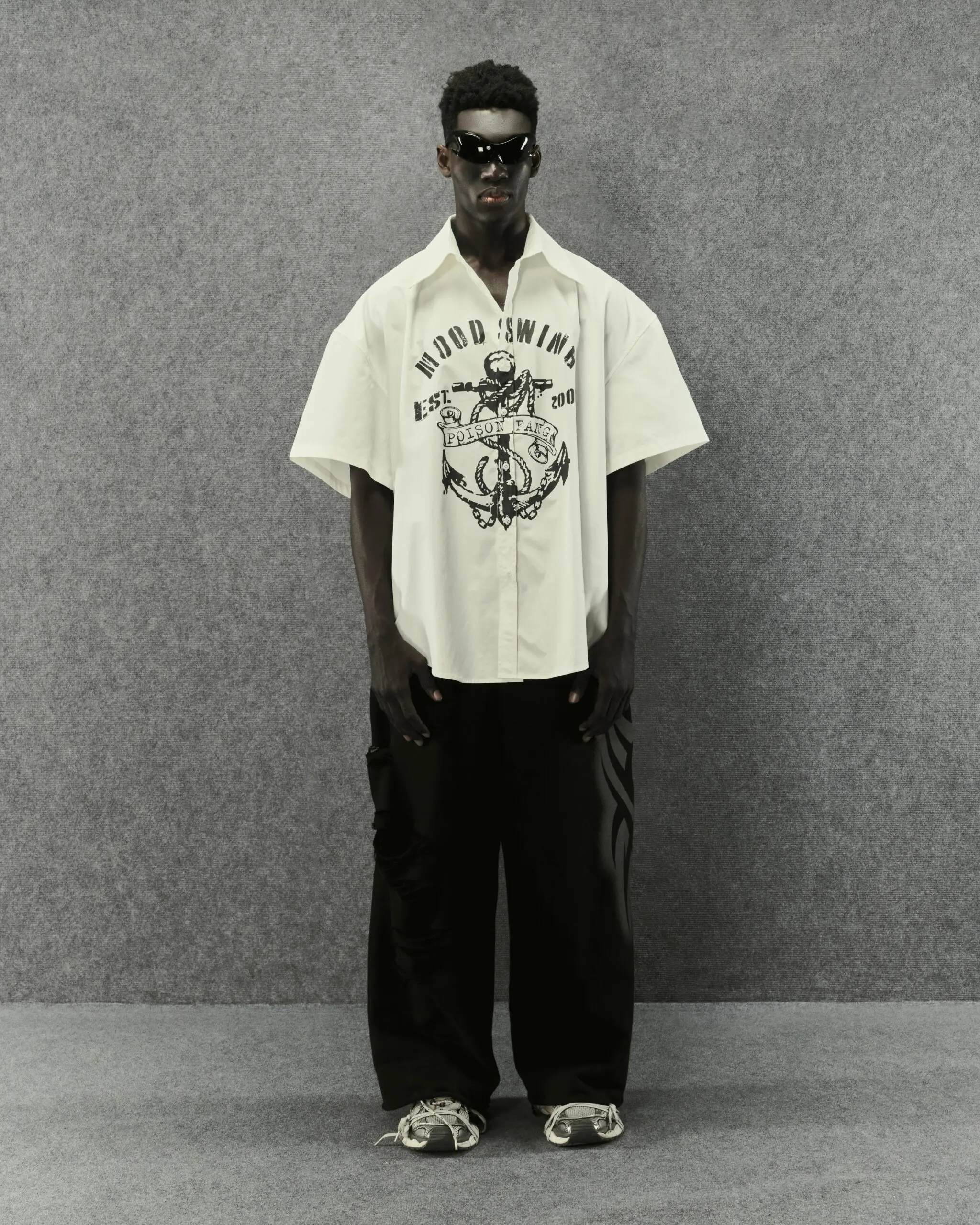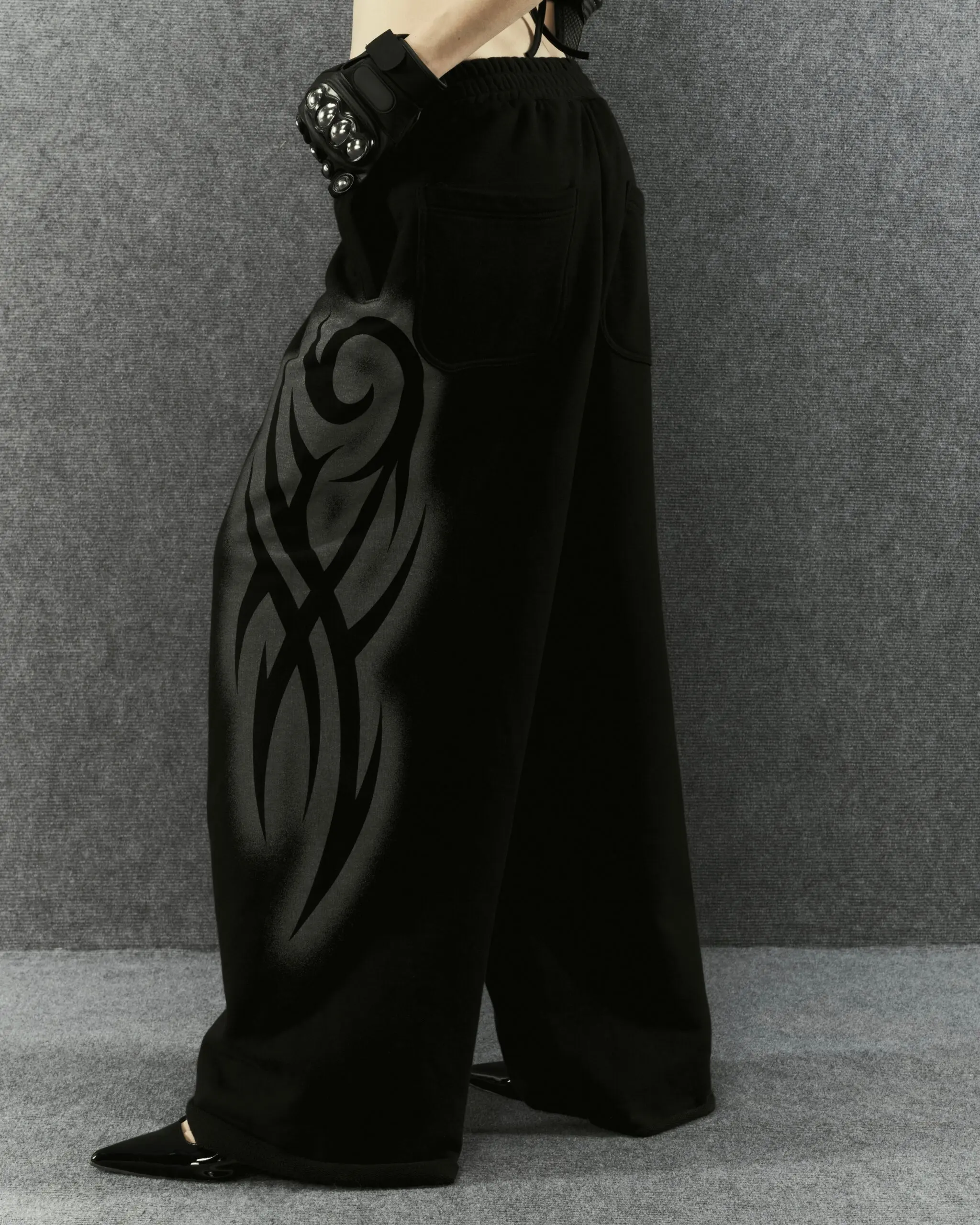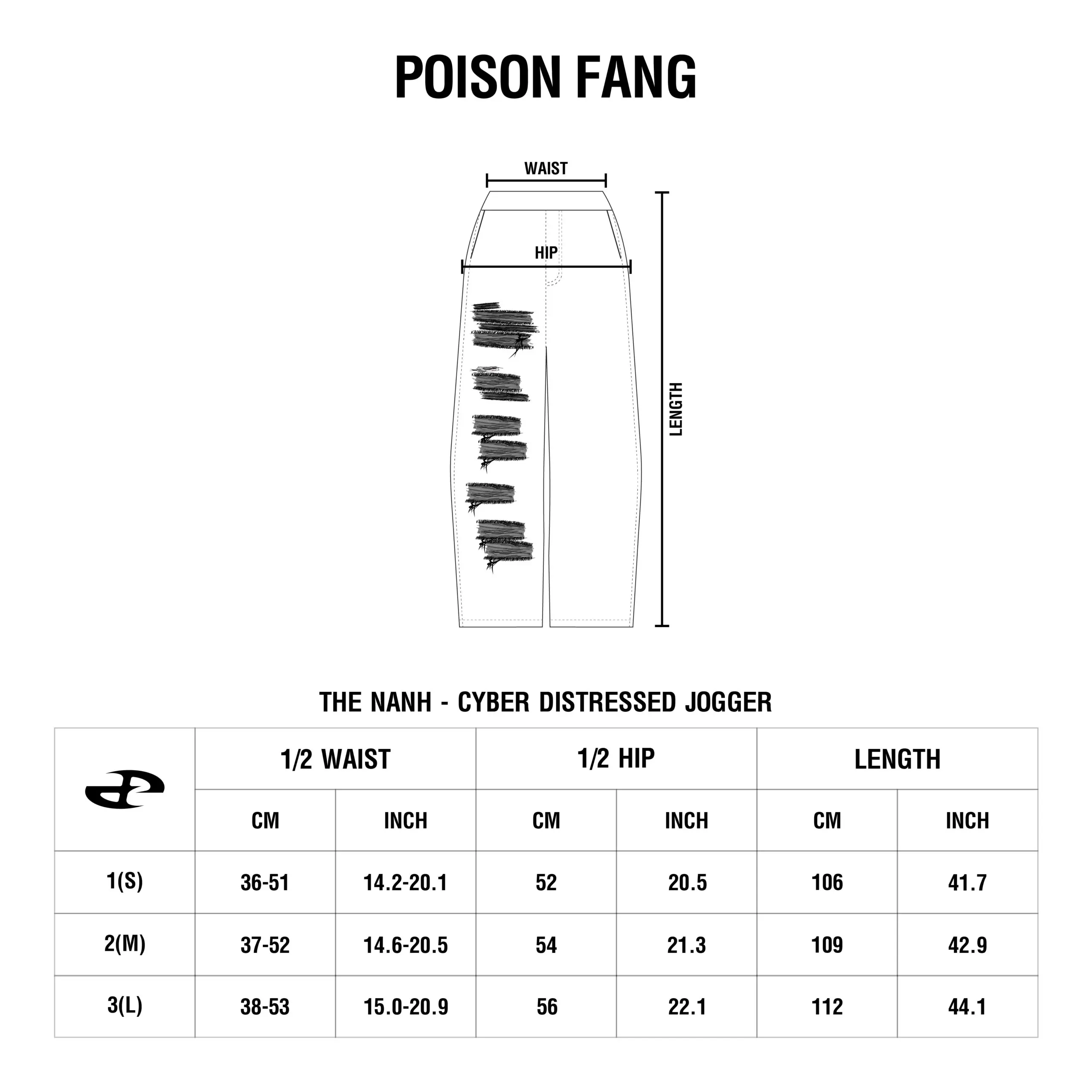 Designed in a bold oversized fit, the pants feature dual side pockets and two rear pockets for functional balance. A dropped crotch and wide-leg construction define the relaxed silhouette. One leg is finished with digitally printed cyber artwork, while the other is hand-distressed through artisanal techniques creating a raw contrast between graphic precision and organic imperfection.