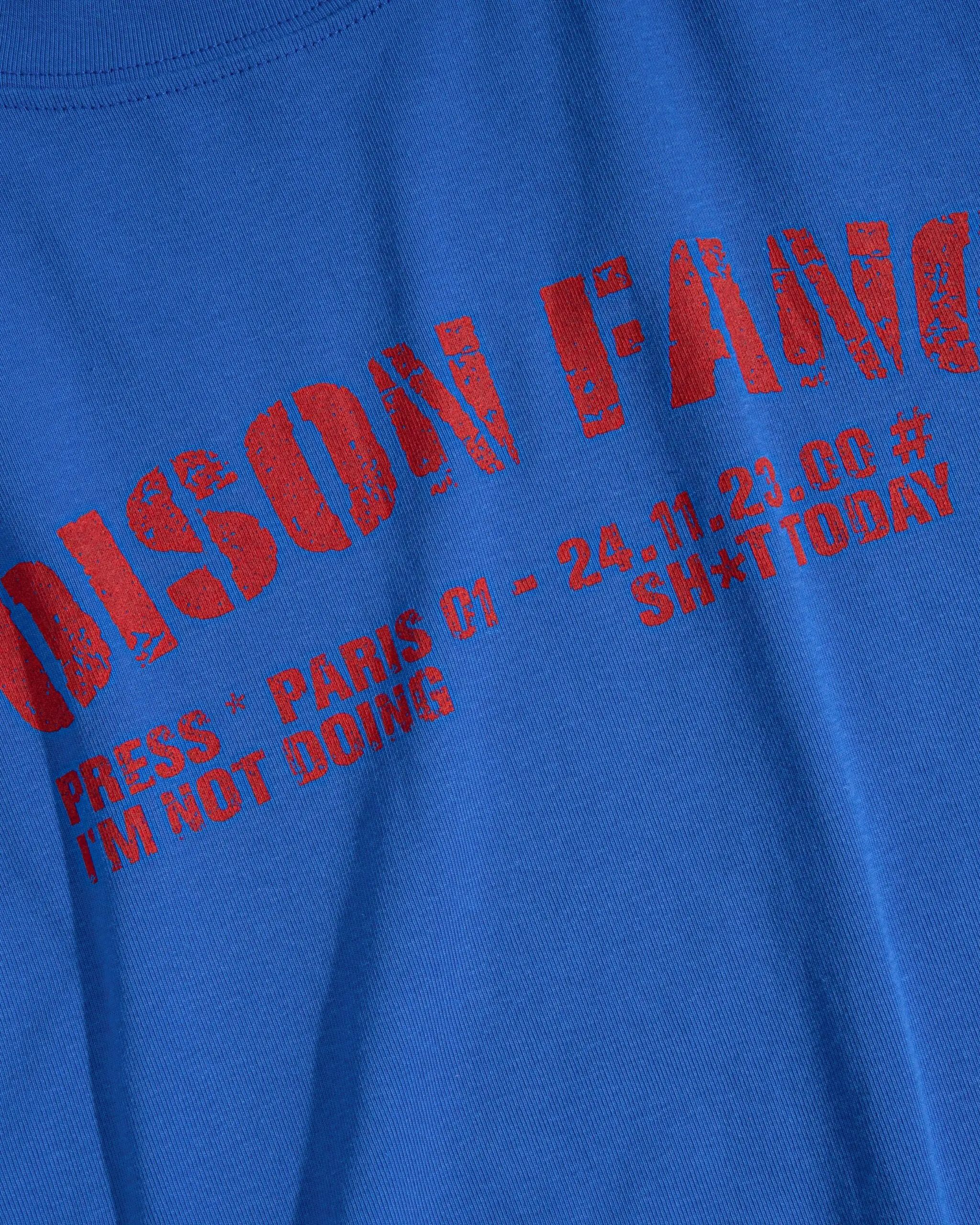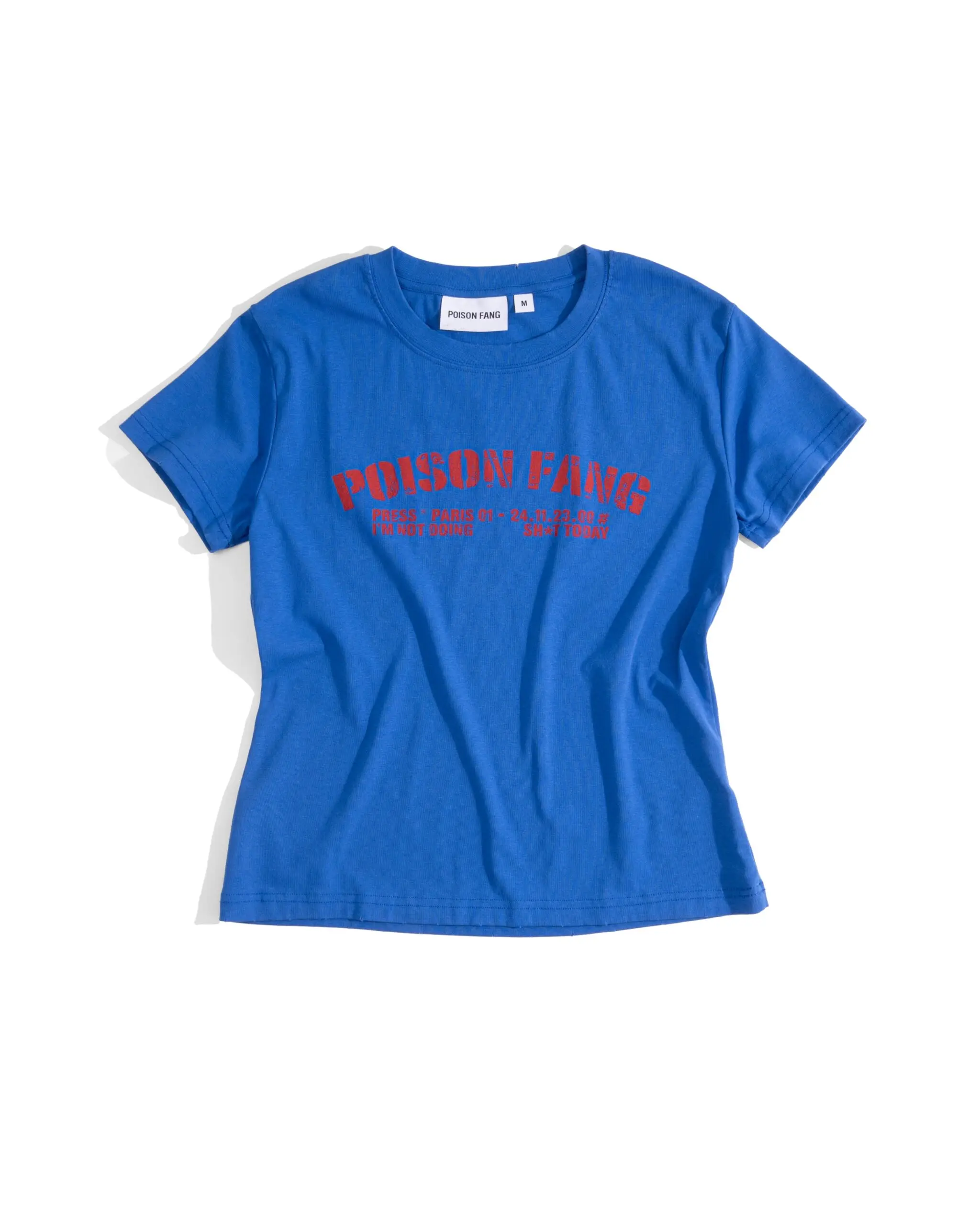 Crafted in a signature baby tee silhouette, made from a premium blend of 95% cotton and 5% polyester for subtle stretch and elevated comfort. The iconic blue hue defines the piece, offering a versatile unisex appeal. Hand-distressed details are meticulously refined along the neckline and sleeves, introducing a raw yet deliberate finish to the design.